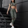 The crop top features a close, structured fit that highlights the upper body while keeping the design clean and minimal. The high-waisted leggings provide a smooth, contouring silhouette, with the camo pattern flowing consistently across the entire set.