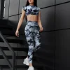 The crop top is designed with a tight, body-hugging fit that keeps the silhouette clean and focused. The leggings feature a high-waisted cut, providing a smooth and continuous line from waist to ankle, with the pattern aligned across both pieces.